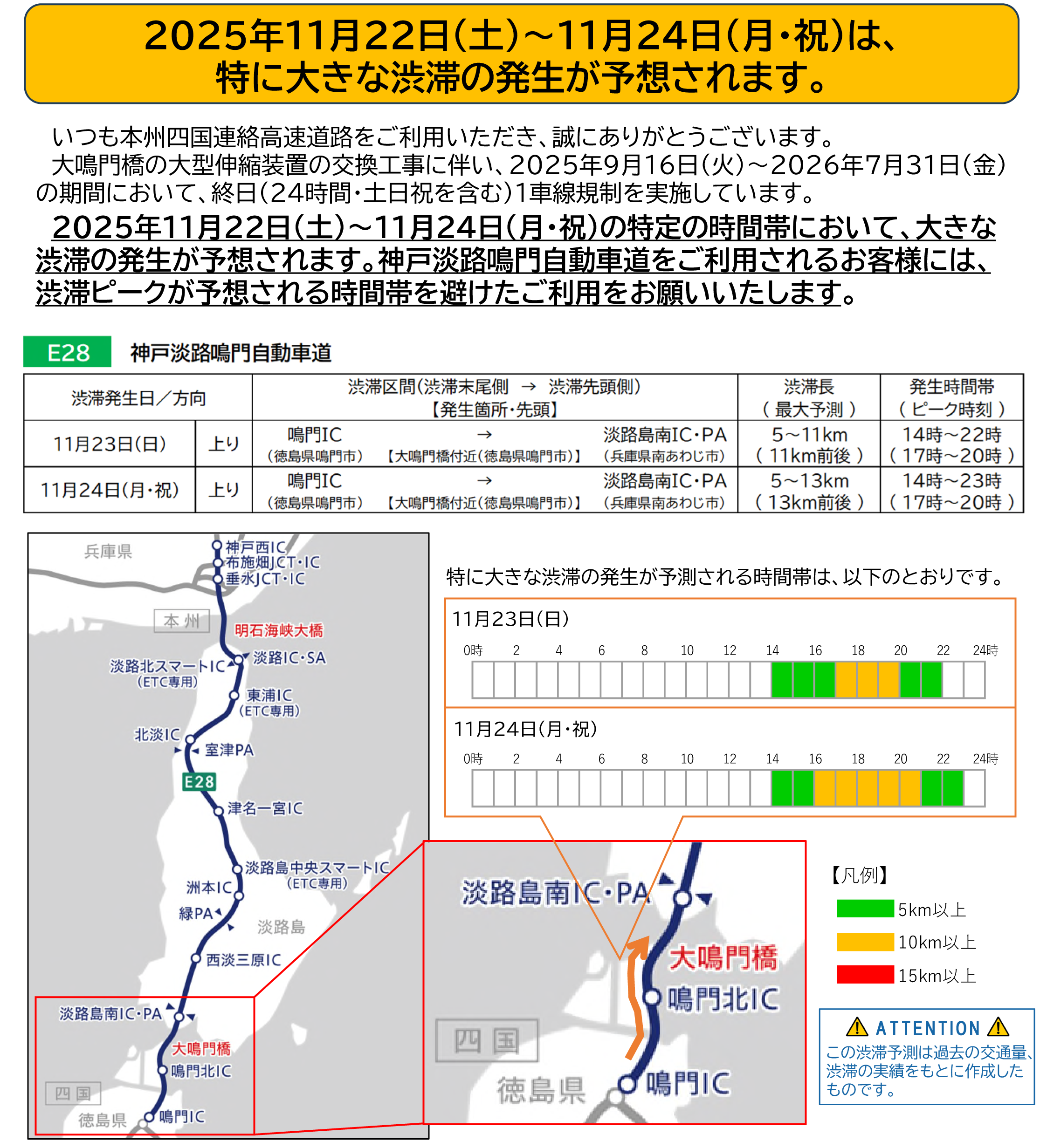E28 神戸淡路鳴門自動車道 鳴門北IC~淡路島南IC間(下り線)大型伸縮装置交換工事に伴う終日1車線規制のお知らせ【JB 本四高速ホームページ内】