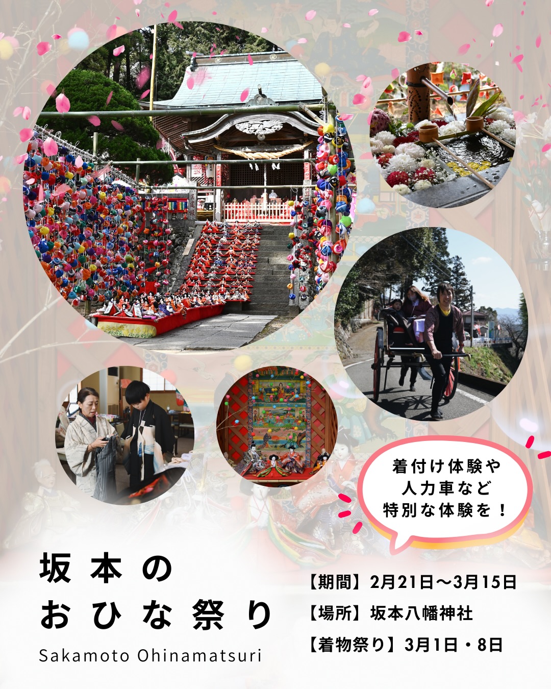 メイン会場の坂本八幡神社には、境内のいたるところにお雛さまや吊るし雛が飾られます。