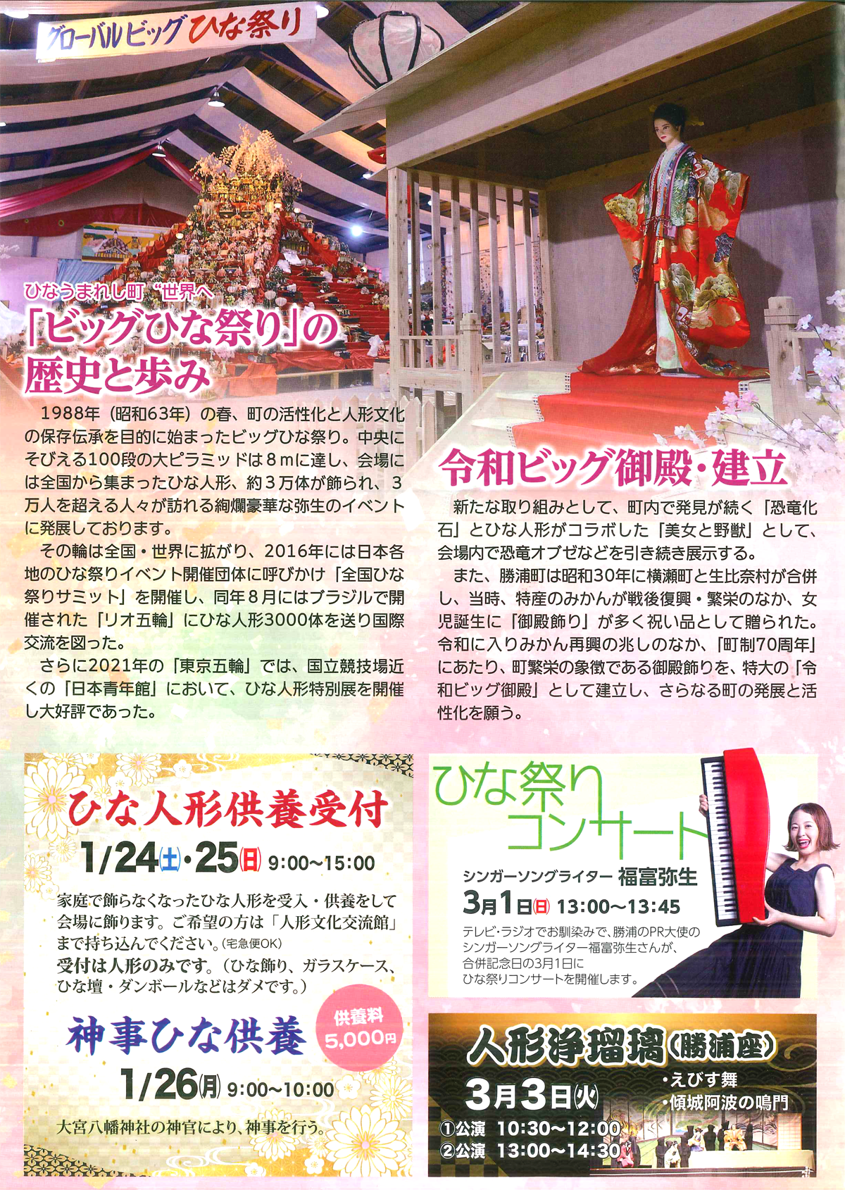昭和63年の春に始まったビッグひな祭りは、今回で38回目を迎えます。本祭では、全国より、家庭で飾られなくなった雛人形を集め、供養し、展示させていただいております。場内には、中央にそびえ立つ高さ約8m「百段のひな壇」をはじめ、約3万体もの雛人形が豪華絢爛に飾られています。