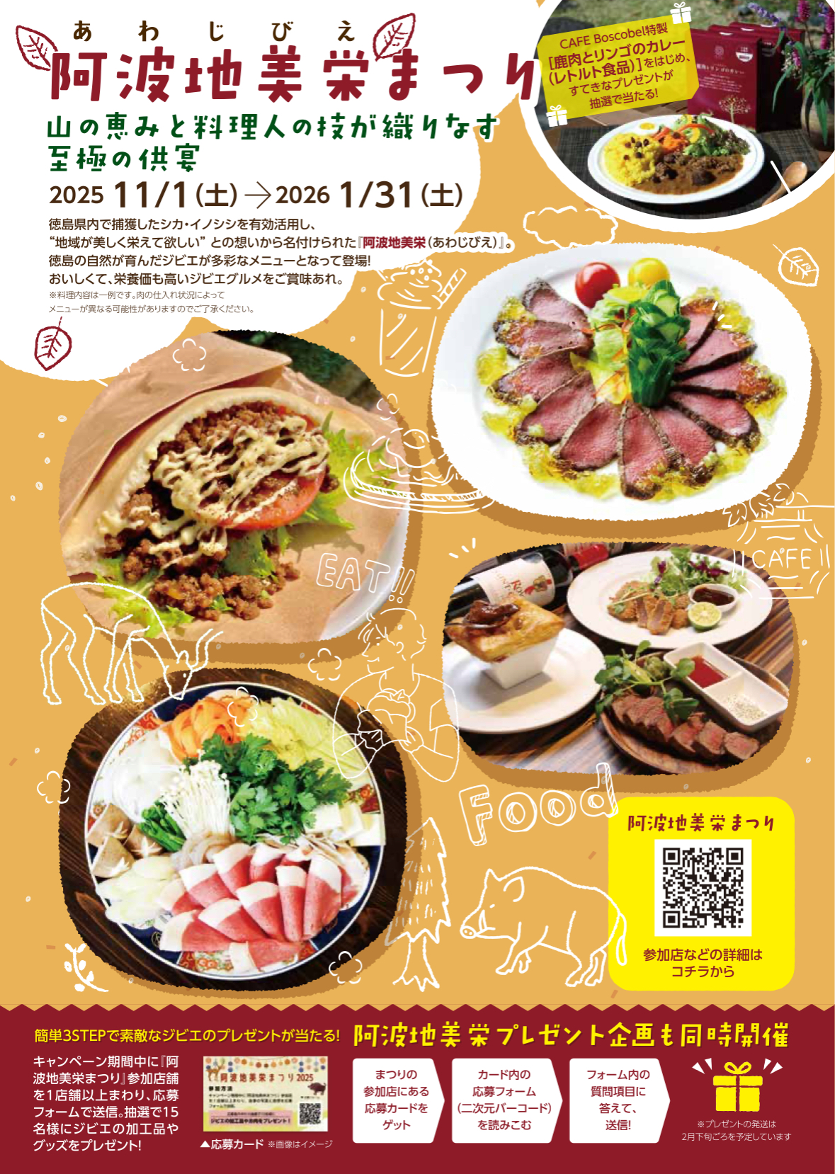 徳島県では、野生鳥獣による農作物被害の防止およびシカ・イノシシを有効活用するため「地域が美しく栄えて欲しい」との思いを込めて『阿波地美栄(ジビエ)』のブランド化に取り組んでいます。
