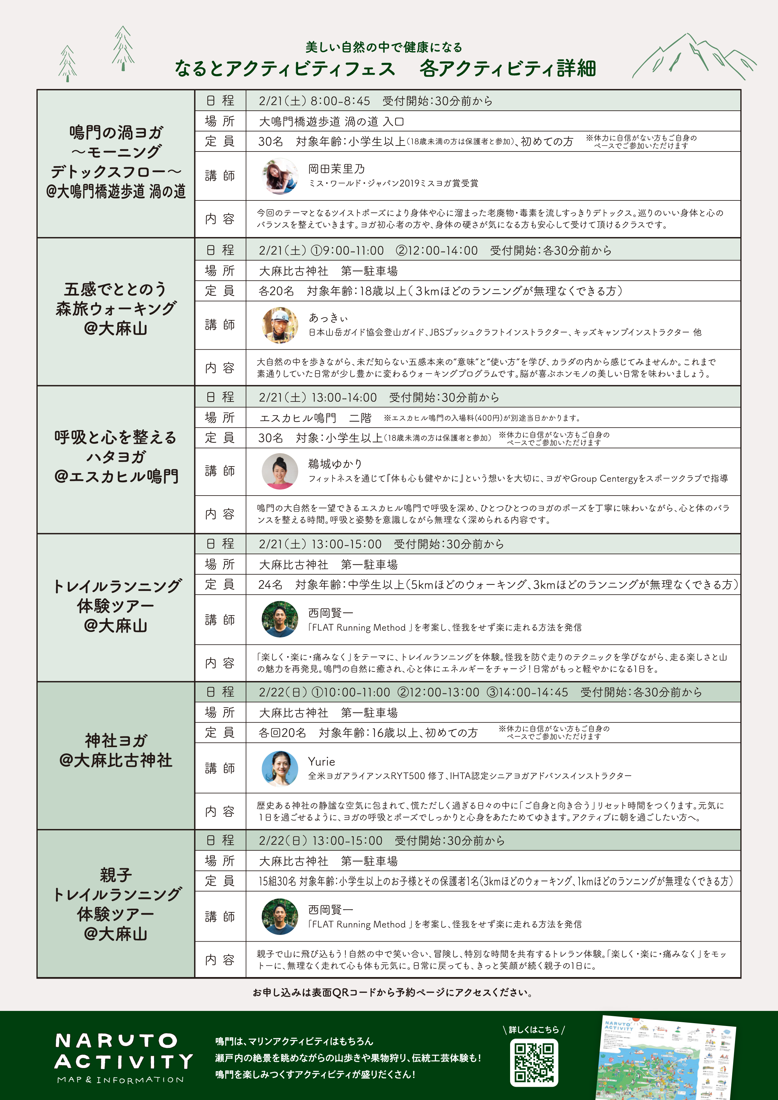 鳴門の渦を見ながらのヨガ、五感でととのう森旅ウォーキング、トレイルランニング体験ツアーなど多彩なプログラムを通じて、日常の喧騒を忘れ、自然と調和する時間をお過ごしください。