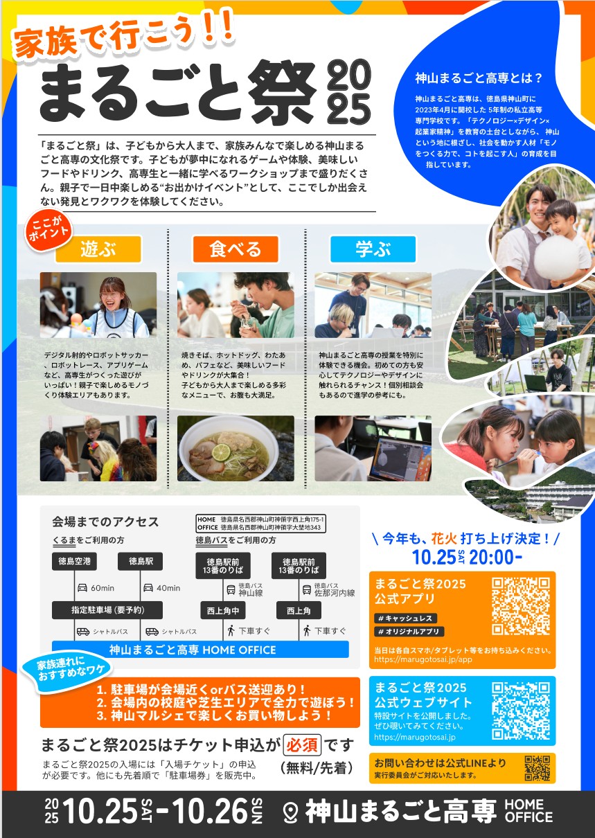 まるごと祭は、モノづくりの力とコト起こしの力を集結させ「テクノロジーで、感動を届ける」神山まるごと高専の特別な祭典です。テクノロジー体験展示、アート作品、授業成果物、地域の方々と共につくるコンテンツ、神山まるごと高専生になれる体験、物販・飲食、ステージ発表など、五感をくすぐる多彩なプログラムがそろいます。