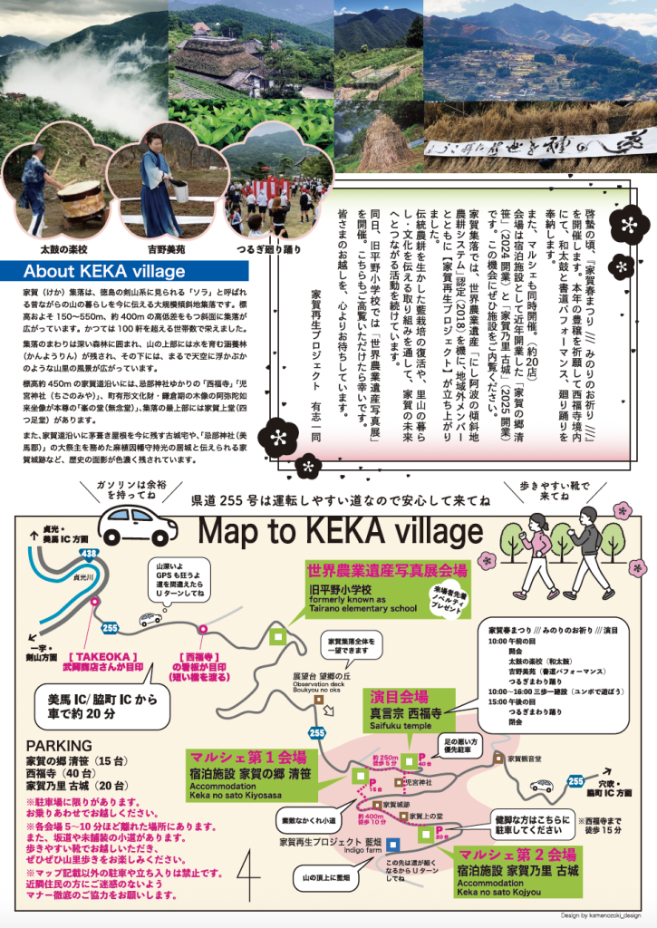 ※各会場5~10分ほど離れた場所にあります。また、坂道や未舗装の小道があります。歩きやすい靴でお越しいただき、ぜひぜひ山里歩きをお楽しみください。