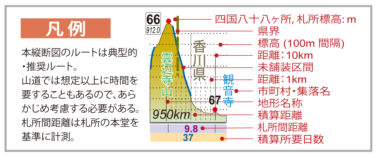 遍路旅にかかる所要日数は、個人差があるので一概には言えませんが、右の縦断図は、測量士の私が入念に距離と高さを図上計測し、1日のスタートとゴールである宿の所在地と、さらに札所での納経時間(30分)を考慮しながら平均的な体力の人を想定して時速3.5km(山間部の未舗装路は2.0km程度)で立案した典型的な遍路プランなので参考にしてください。遍路のルートは複数ありますが、最も基本的なルートで作図しました。なお、距離の定義は、水平距離であって勾配は考慮していないことを付け加えておきます。