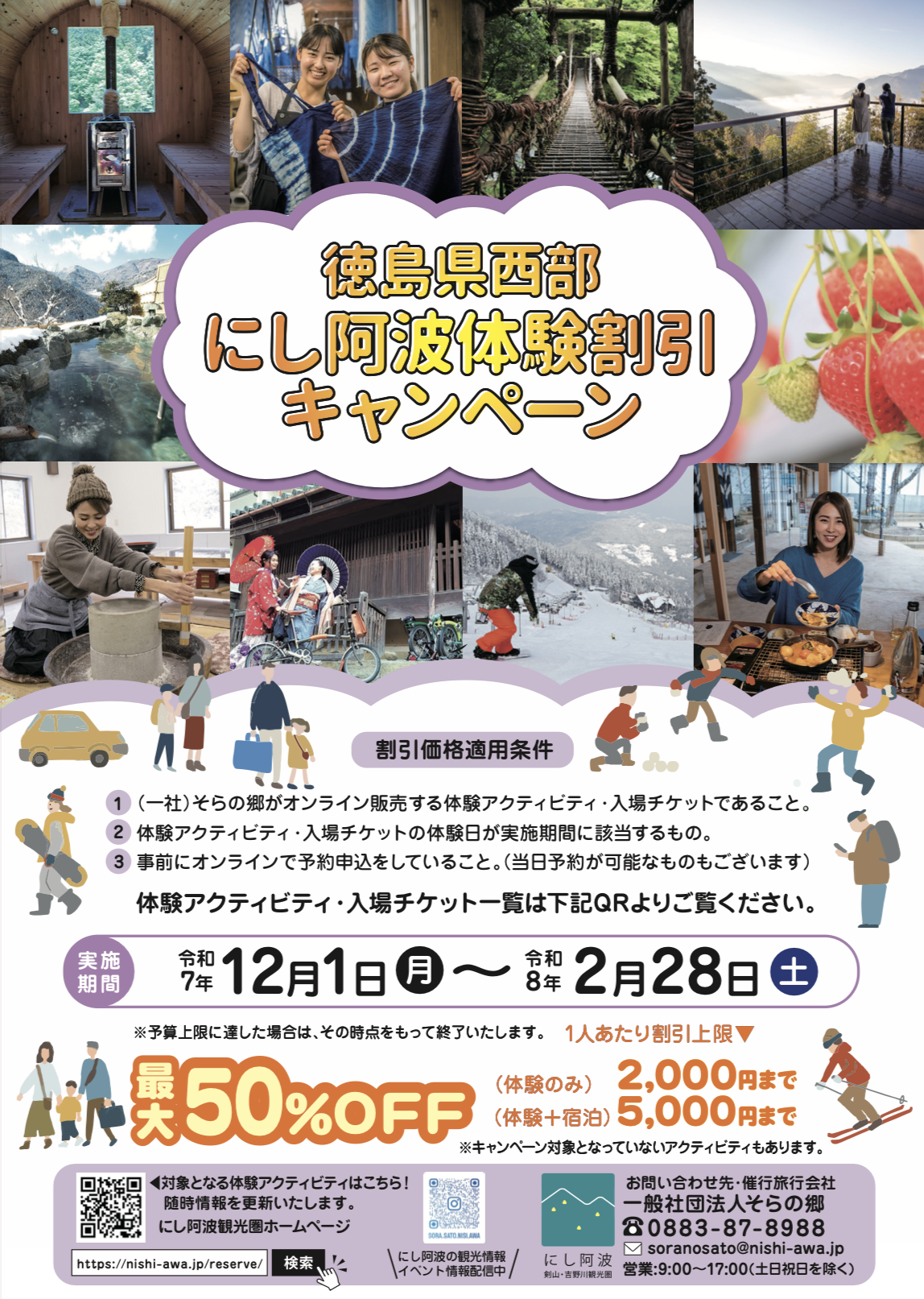 地元の自然や文化、人とのふれあいが楽しめる体験コンテンツが、通常価格から最大50%割引で楽しめるお得なキャンペーンを実施します!