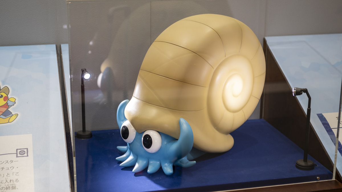 うずまきポケモン「オムナイト」です。「アンモナイト」と同様に、ポケモンの世界で大昔の海に住んでいた生き物で、脚が10本ある特徴も瓜二つですが、双方の世界で絶滅した理由は違っているようです。その理由の違いが気になる方はぜひ会場に足を運んでみてください。