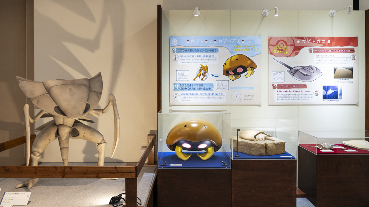 こちらは、こうらポケモン「カブト」と、そのしんかけい「カブトプス」。「カブト」は3億年前から姿が変わっていないといわれている「生きたカセキポケモン」です。私たちの世界での「生きた化石」といえば…、そう「カブトガニ」ですね。身体の特徴もよく似ていますが、目の数など少し違いがあるようです。