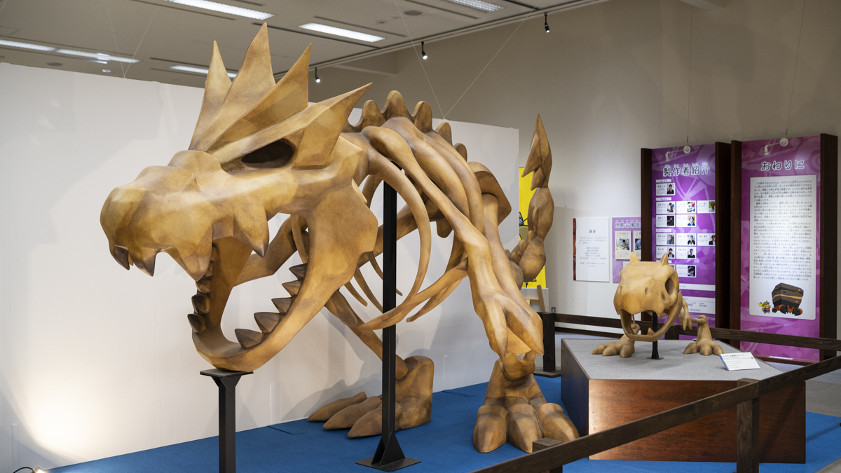 そして、最後に展示されていたのがこちら。ぼうくんポケモン「ガチゴラス」の骨格イメージです。高さ2.5mの実物大スケールが再現されていて、すごい迫力。これと似ている私たちの世界の古生物といえば、誰もが知る“あの肉食恐竜”ですね!もちろんその骨格も展示されているので、現地で見比べてみましょう。