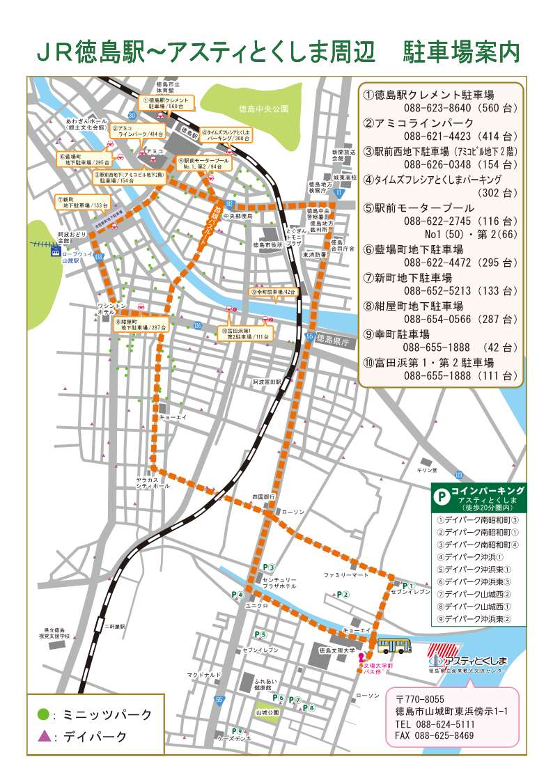 アスティとくしまの駐車場には限りがありますので、公共交通機関のご利用や、お車でお越しの場合はJR徳島駅周辺の駐車場のご利用にご協力ください。