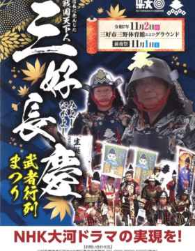 戦国を代表する武将・三好長慶の雄姿を再現する「三好長慶武者行列まつり」を、三好市三野町の三野体育館およびグラウンドで開催します。